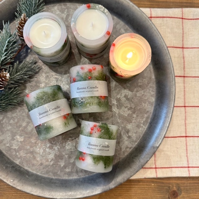 クリスマスをイメージしたボタニカルキャンドル 高さ6cmほどのミニキャンドル 小さくてもふわっと明るく灯ります 大体1.5時間ほどで一度消して また再度同じように繰り返し お使いください。 中はクリーミーなソイワックスで カシスの香りで仕上げてます だんだん冬に近づいて寒くなる季節に 暖かな灯りを見て過ごしていただきたいです 【香り】 カシス 【素材】 ソイワックス パラフィン 【サイズ】 高さ約6cm×直径5cm
